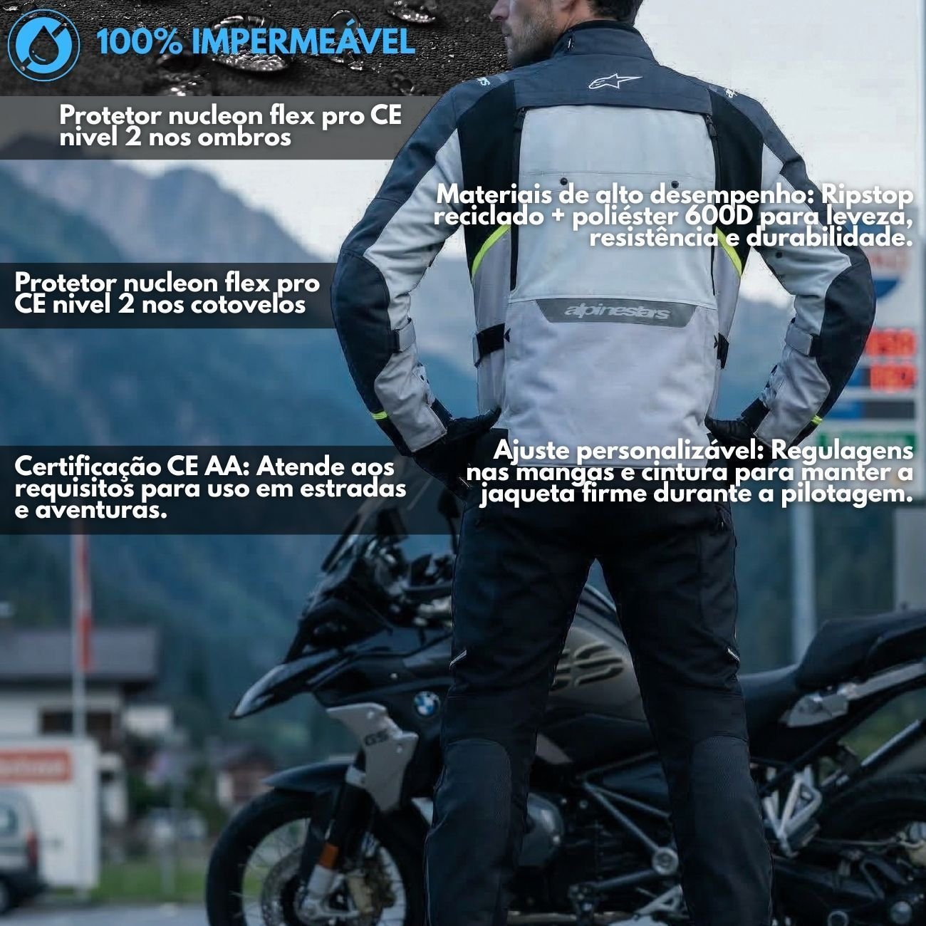 Fabricada em um mix de Ripstop reciclado e poliéster 600D, a Cusco Drystar oferece uma estrutura leve e extremamente resistente à abrasão. A segurança é elevada ao nível profissional com os protetores Nucleon Flex Pro CE Nível 2 nos ombros e cotovelos, que superam os padrões exigidos pela categoria. Além de possuir certificação CE Classe AA, a jaqueta é totalmente compatível com os sistemas de airbag Tech-Air da Alpinestars, garantindo proteção de elite para estradas e aventuras.
