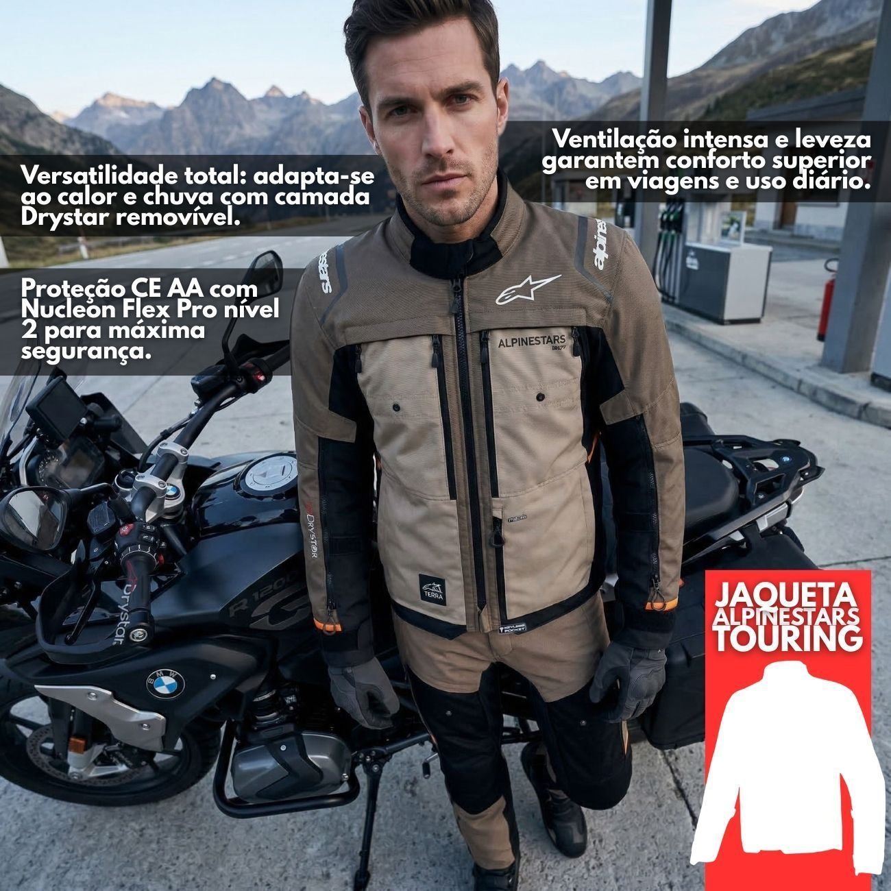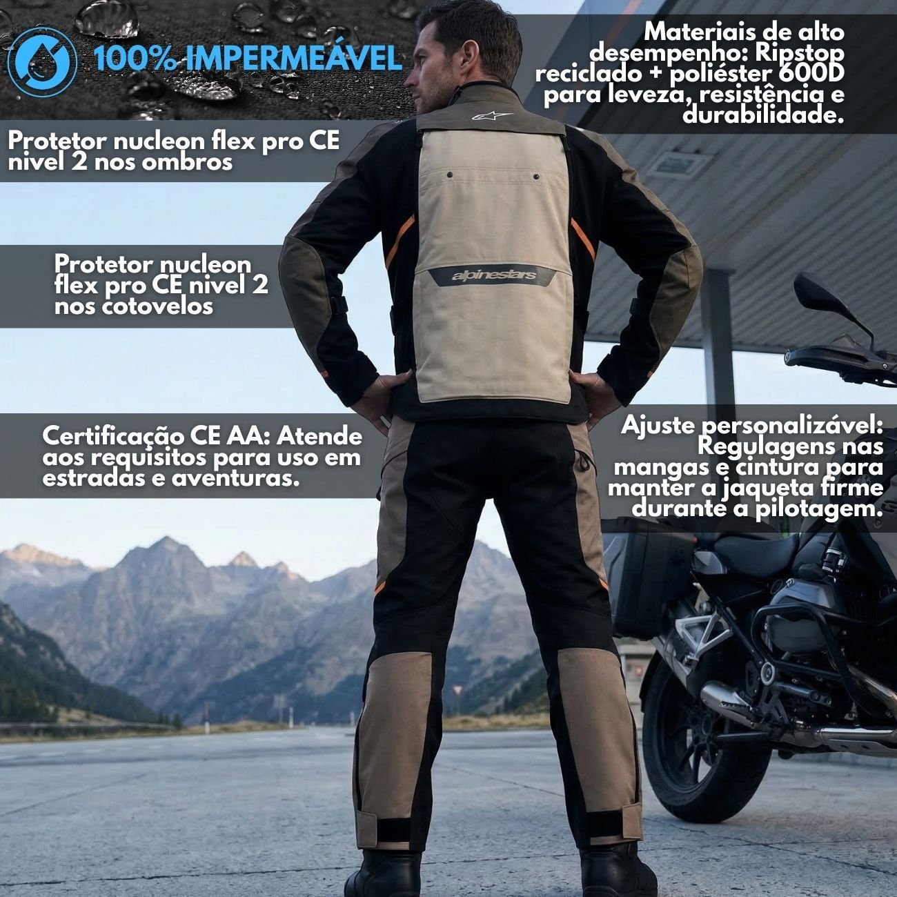Fabricada em um mix de Ripstop reciclado e poliéster 600D, a Cusco Drystar oferece uma estrutura leve e extremamente resistente à abrasão. A segurança é elevada ao nível profissional com os protetores Nucleon Flex Pro CE Nível 2 nos ombros e cotovelos, que superam os padrões exigidos pela categoria. Além de possuir certificação CE Classe AA, a jaqueta é totalmente compatível com os sistemas de airbag Tech-Air da Alpinestars, garantindo proteção de elite para estradas e aventuras.