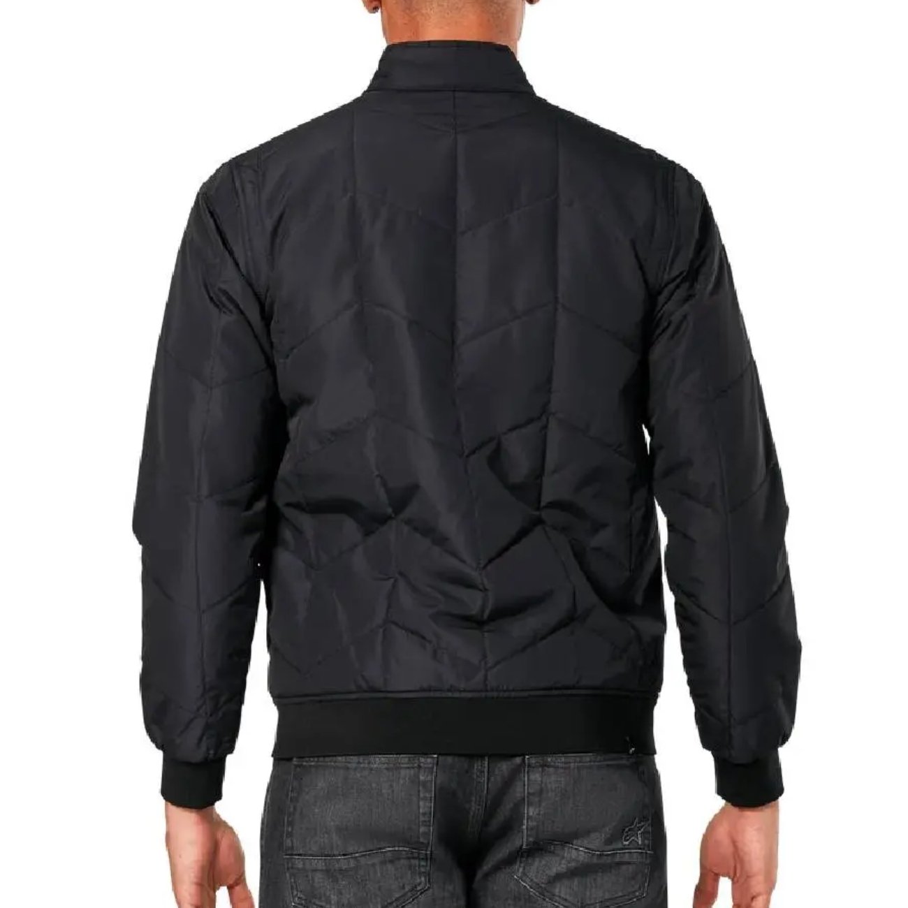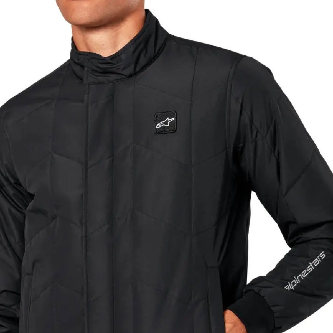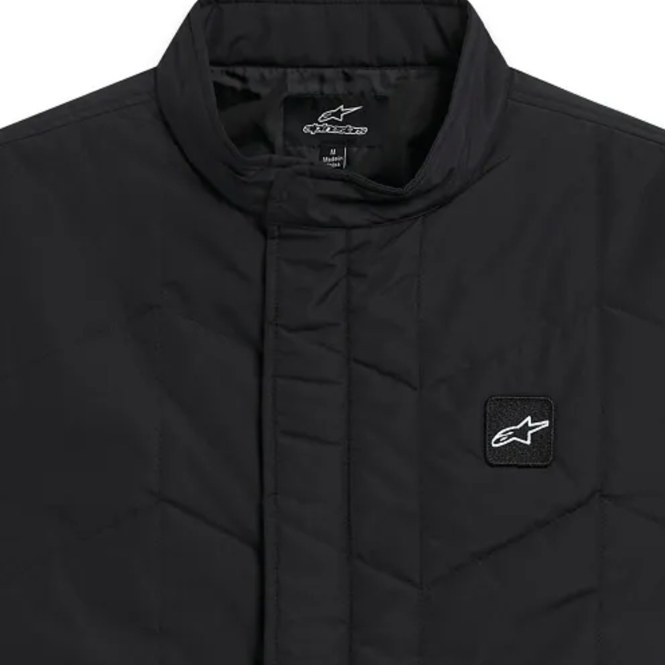 Os bolsos inferiores com zíper oferecem praticidade e segurança para guardar objetos pessoais. O padrão acolchoado em ângulo confere identidade única, reforçada pela etiqueta interna e detalhes da marca, como o patch de logo no peito e bordado na manga, que destacam a qualidade e o acabamento da peça.