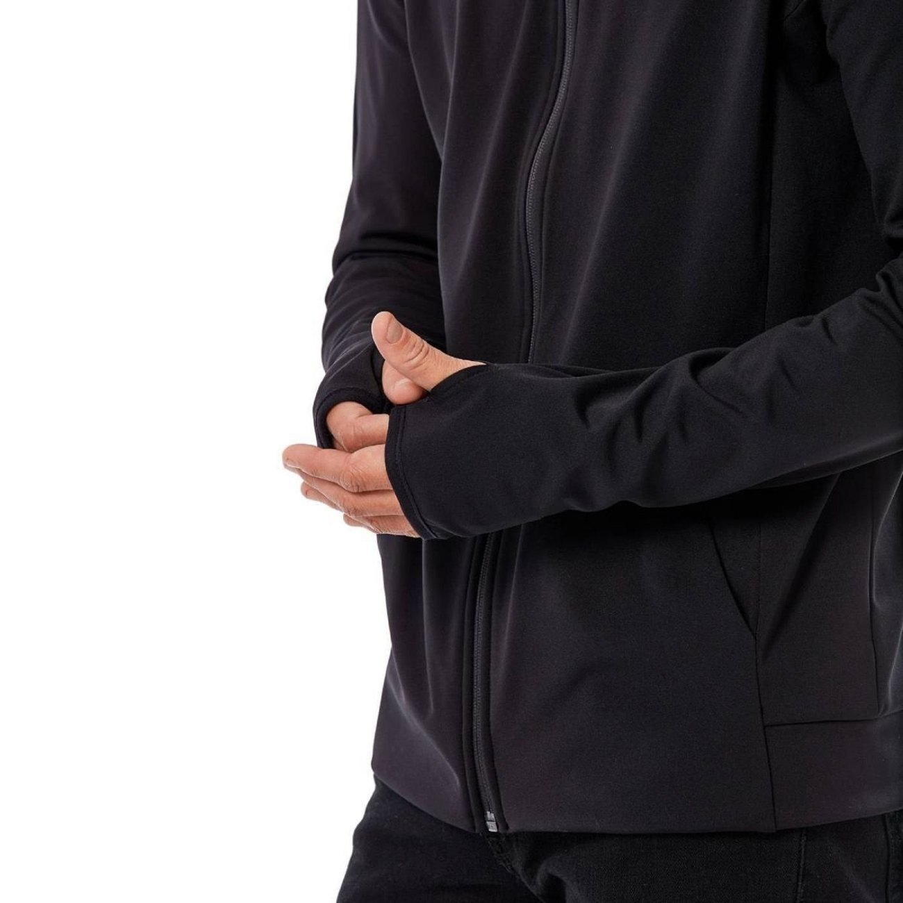Abertura para encaixe do polegar nas mangas, garantindo proteção e mobilidade;
