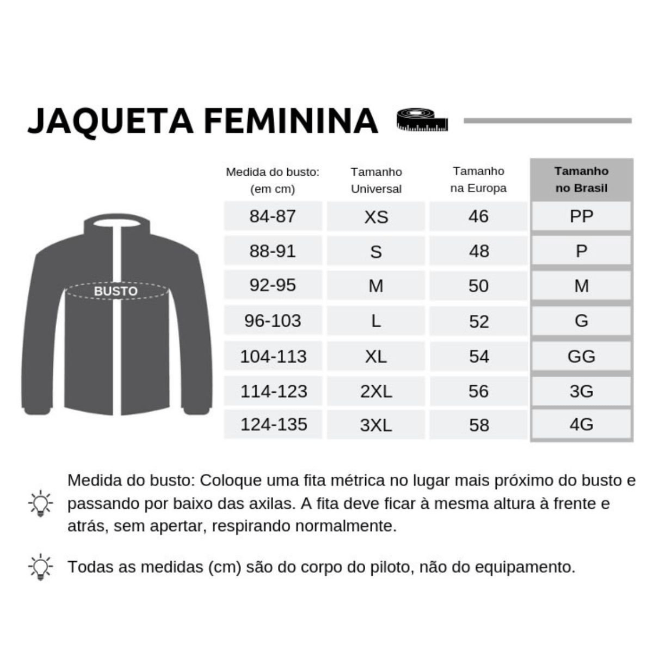 Modelagem Stella: Design anatômico moldado para o corpo feminino, com mangas pré-curvadas que reduzem a fadiga e proporcionam um ajuste natural na posição de pilotagem.