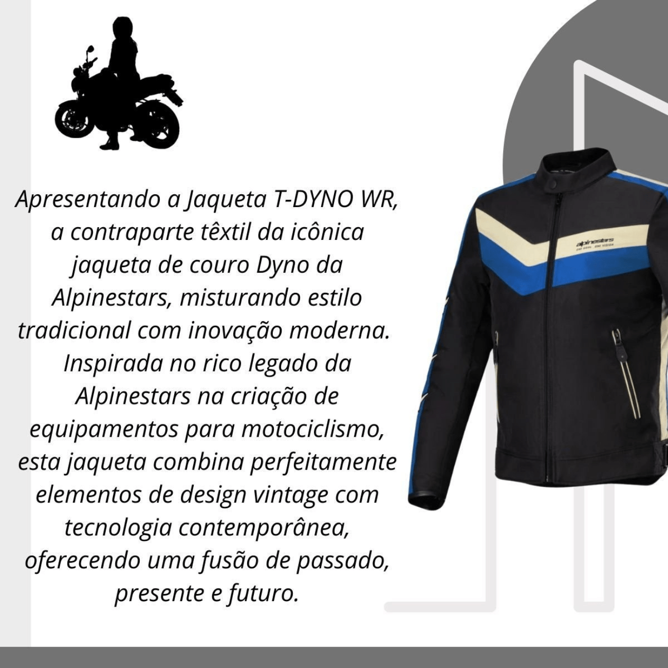 A Jaqueta T-DYNO WR da Alpinestars une o estilo clássico vintage à inovação tecnológica, oferecendo proteção e conforto para motociclistas que buscam desempenho aliado a uma estética atemporal. Inspirada na icônica jaqueta de couro Dyno, esta versão têxtil traz materiais modernos e funcionalidades que acompanham as exigências do piloto contemporâneo.