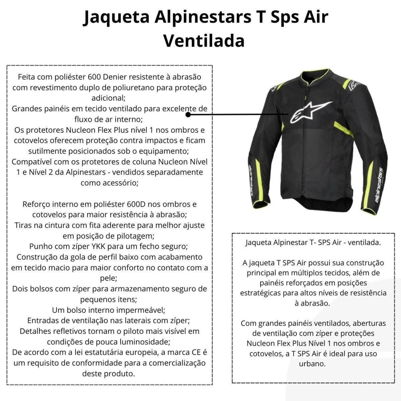 A Jaqueta Alpinestars T-SPS Air V2 é a escolha ideal para motociclistas urbanos que buscam alto desempenho aliado a excelente ventilação e proteção. Com grandes painéis de malha no peito, costas e braços, a jaqueta garante fluxo de ar otimizado mesmo em dias quentes, proporcionando conforto sem abrir mão da segurança. Desenvolvida em poliéster 600D resistente, conta com zonas perfuradas estrategicamente posicionadas para maximizar a respirabilidade.