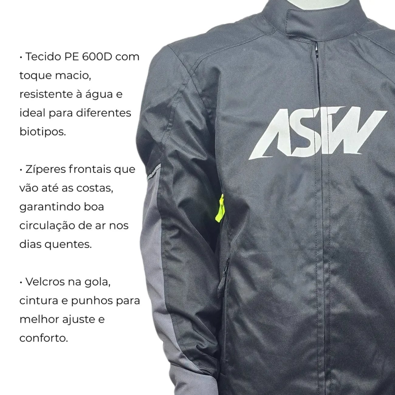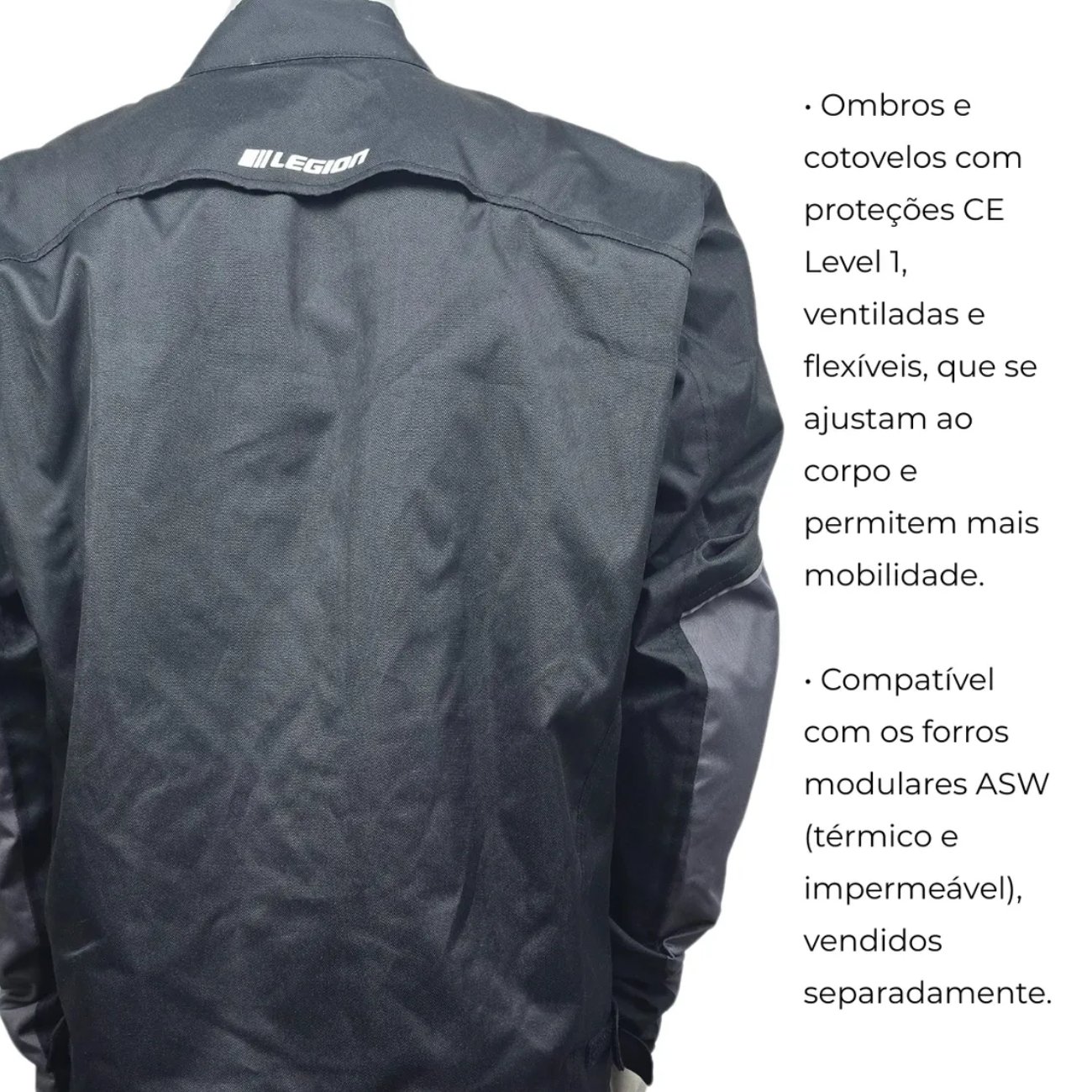 Com a missão de entregar ao brasileiro mais conforto para o dia a dia, a ASW desenvolveu a Legion, um produto com fit 100% brasileiro que se encaixa perfeitamente aos mais variados biotipos usando tecido PE 600D, que também eleva a segurança do motociclista. Para uma experiência ainda mais exclusiva, a Legion é confeccionada com filamento contínuo e construção 80/40 (fios por polegada) que garante um toque mais agradável e macio, além de maior resistência a permeabilidade de água.