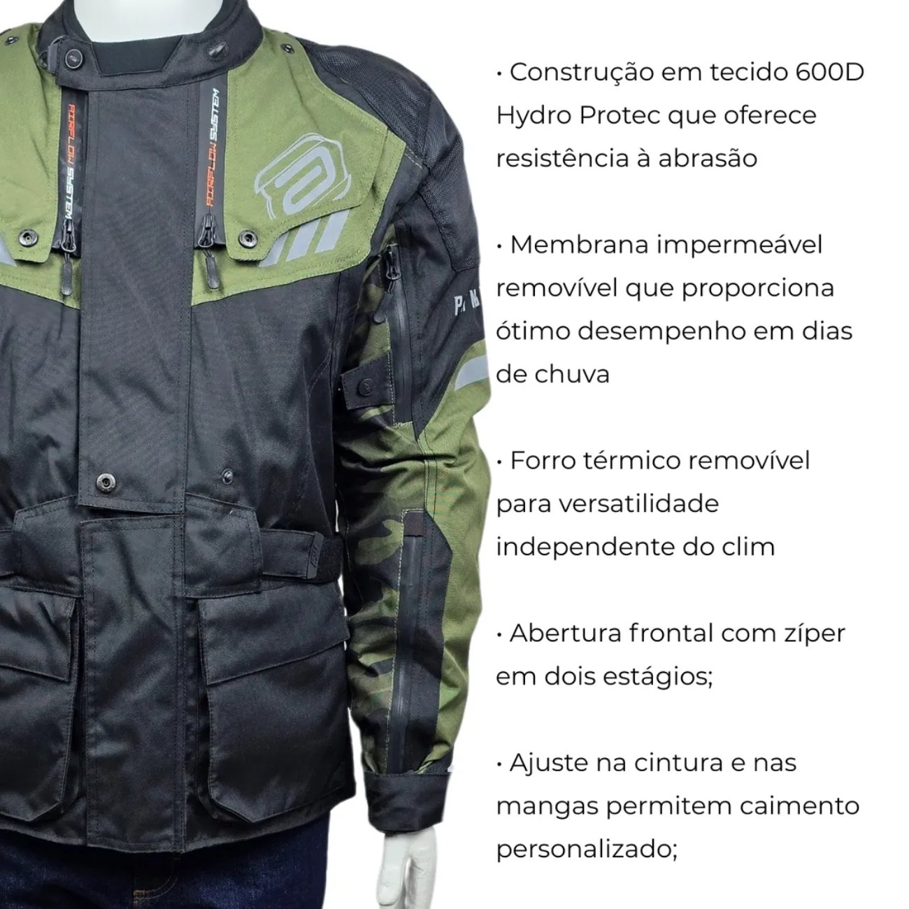 Seu design estilo parca conta com múltiplos ajustes na cintura e mangas, construção anatômica com painéis sanfonados e zíper duplo frontal que proporciona mais conforto ao sentar-se, evitando dobras na região abdominal.
