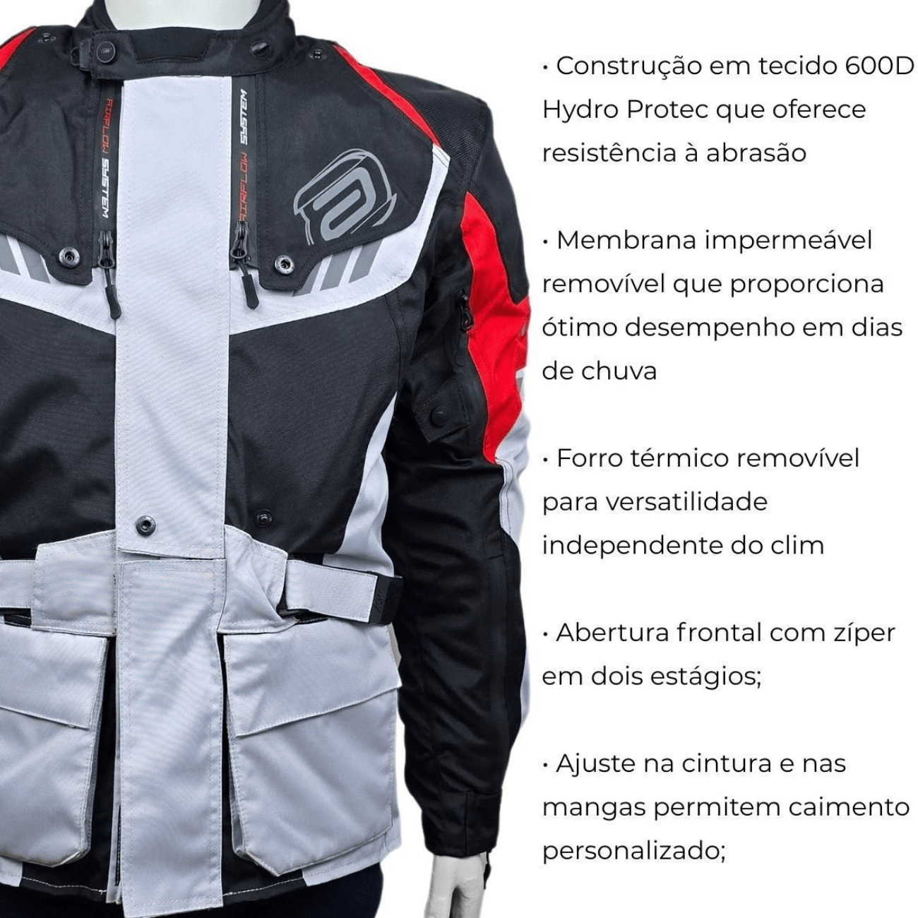 Possui por dentro uma segunda camada impermeável que mantém o motociclista seco e o zíper náutico da jaqueta quando você fecha, ele veda não deixa infiltrar água e faz com que você se seque mais rápido em sua abertura, permitindo maior ventilação, trazendo conforto e bem-estar ao piloto também em dias mais quentes.