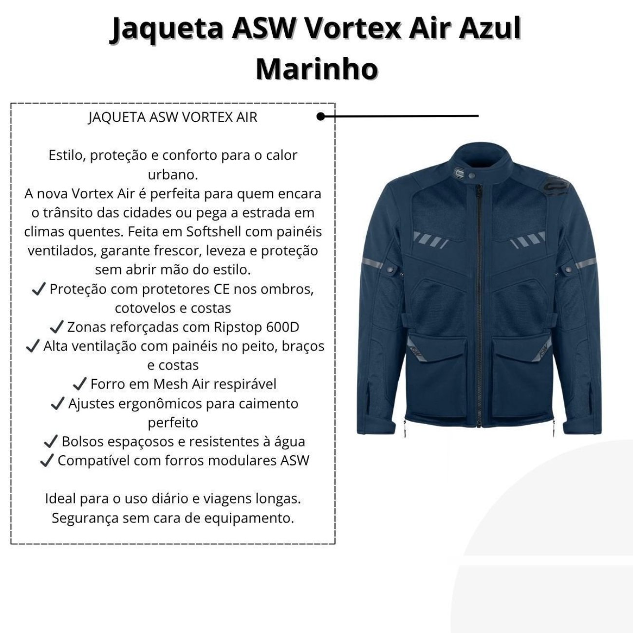 Projetada para quem enfrenta o calor intenso nas ruas ou estradas, a ASW Vortex Air é a jaqueta ideal para motociclistas que buscam ventilação, conforto e segurança com visual urbano e discreto. Sua construção em Softshell com painéis ventilados estratégicos oferece frescor contínuo mesmo em baixas velocidades, tornando-a perfeita para o uso diário e viagens sob sol forte.
