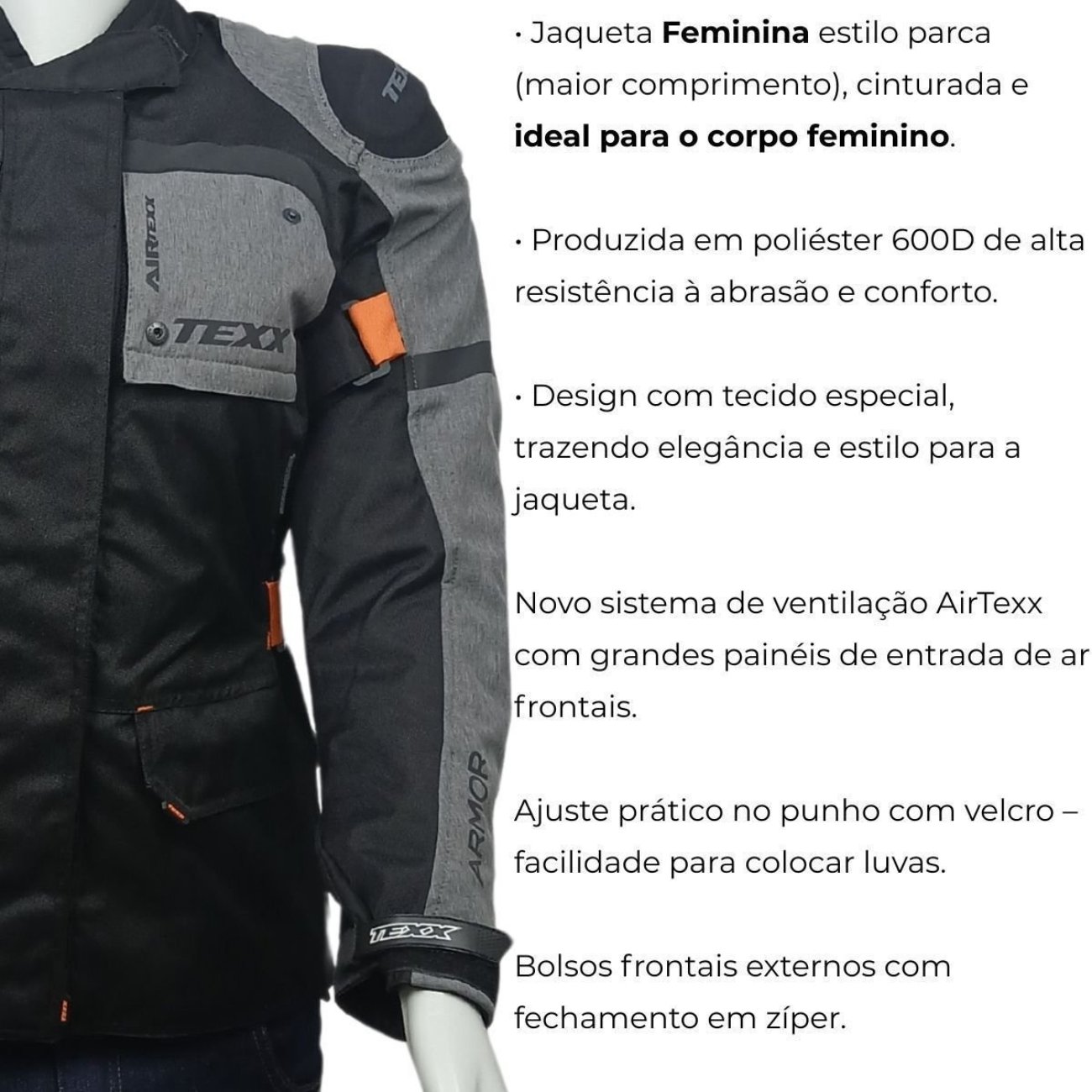 A Jaqueta Armor Lady da TEXX é uma parca feminina projetada para oferecer proteção, conforto e estilo durante a pilotagem. Produzida em poliéster 600D resistente à abrasão, conta com protetores removíveis certificados pela Comunidade Europeia (CE) nos ombros, cotovelos e costas, garantindo segurança confiável. Seu design cinturado valoriza a silhueta feminina e incorpora tecido especial que alia elegância e funcionalidade. Equipada com forro térmico integral removível e sistema de ventilação AirTexx com painéis frontais, adapta-se facilmente a diferentes condições climáticas. A jaqueta também oferece ajustes práticos na cintura e punhos, bolsos impermeáveis e detalhes exclusivos como refletores Dark com tecnologia SHINE TEXX, proporcionando alta visibilidade de forma discreta.