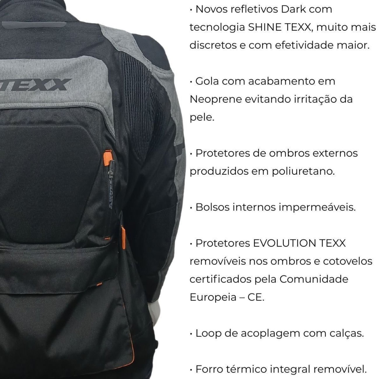 Proteção certificada CE: Protetores Evolution TEXX removíveis nos ombros, cotovelos e costas.