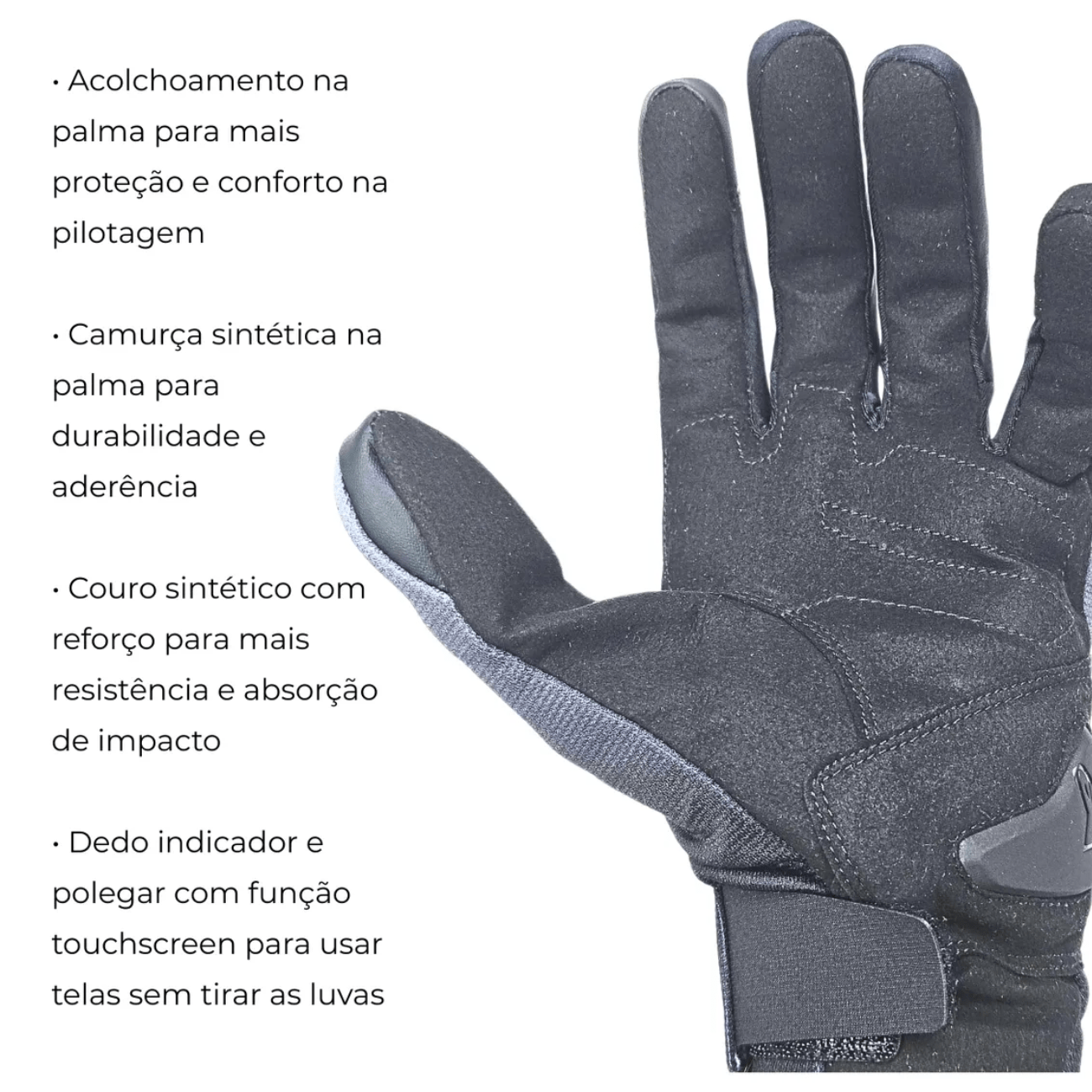 Com construção multimaterial, o dorso da mão recebe tecido elástico para maior flexibilidade e fluxo de ar, enquanto a palma em camurça sintética com reforço acolchoado garante durabilidade e absorção de impacto. A proteção nos nós dos dedos em TPU 3D é macia, ergonômica e eficiente.