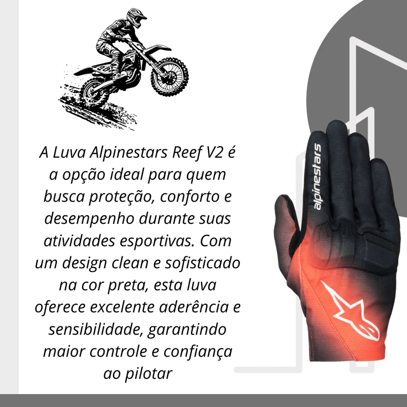 A Luva Alpinestars Reef V2 foi projetada para motociclistas que buscam um equilíbrio ideal entre ventilação, flexibilidade e proteção. Com punho curto e design moderno, ela se adapta a diferentes estilos de pilotagem, seja na cidade ou na estrada, entregando desempenho com conforto e praticidade.