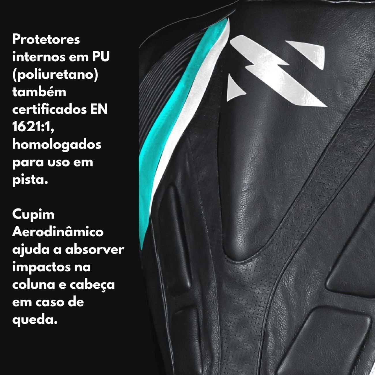 Proteção interna: as proteções internas em PU também são homologadas EN 1621:1, garantindo segurança adicional conforme exigências para uso em pista.