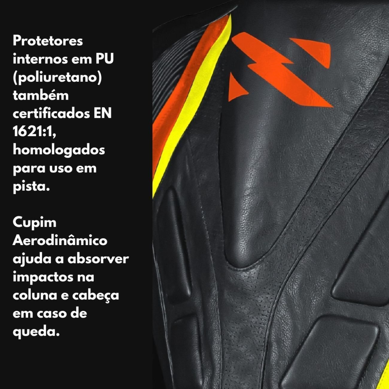 Proteção interna: as proteções internas em PU também são homologadas EN 1621:1, garantindo segurança adicional conforme exigências para uso em pista.