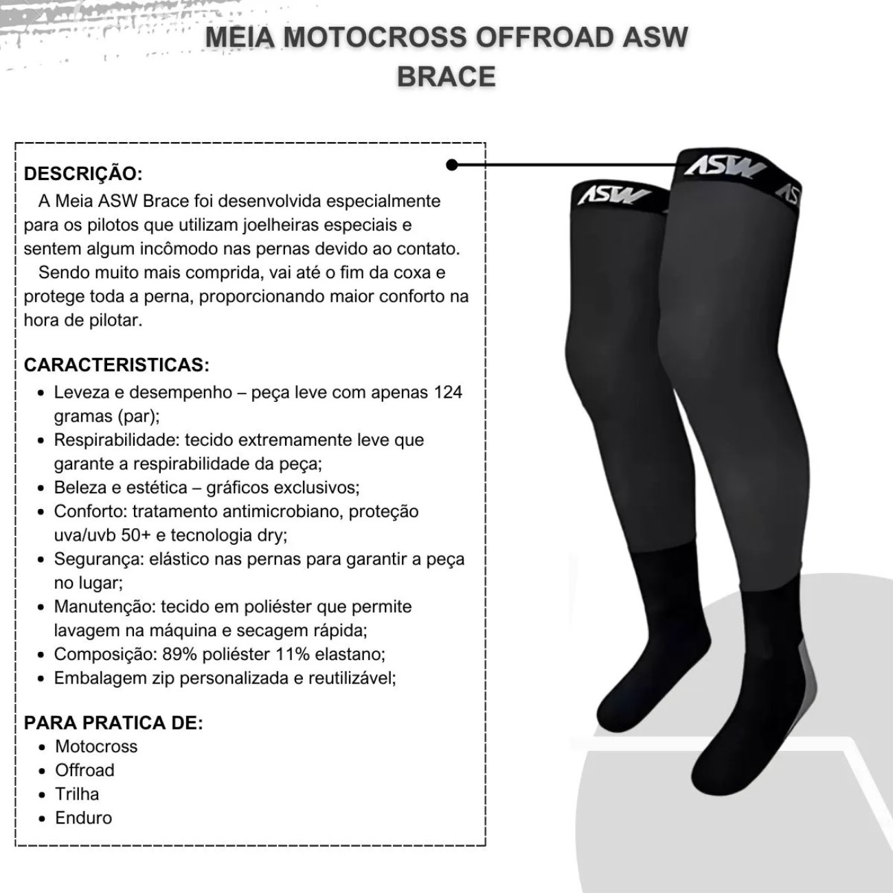 A Meia ASW Brace Chalk foi desenvolvida para atender atletas e pilotos que não abrem mão de desempenho, proteção e conforto em treinos, trilhas ou provas de motocross. Projetada para uso com joelheiras tipo brace, ela possui modelagem pré-curvada que se adapta à perna sem enrolar ou escorregar, mesmo em movimentos intensos.