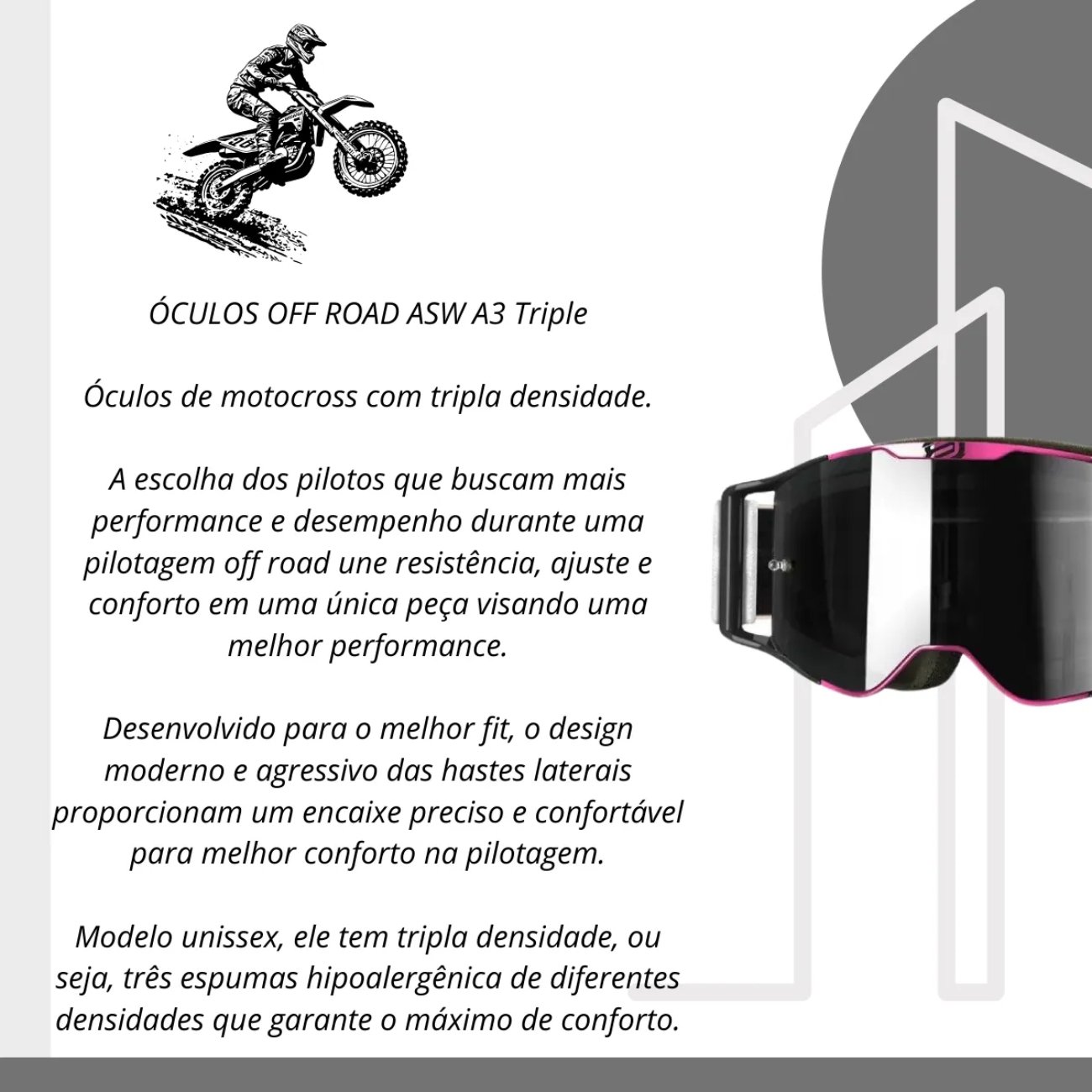 O óculos ASW A3 Triple chega com um visual renovado e ainda mais funcionalidade para quem exige alto desempenho na trilha ou nas pistas. Desenvolvido para oferecer conforto, proteção e durabilidade, esse modelo é ideal para modalidades como motocross, trilha, enduro, cross country e velocross.