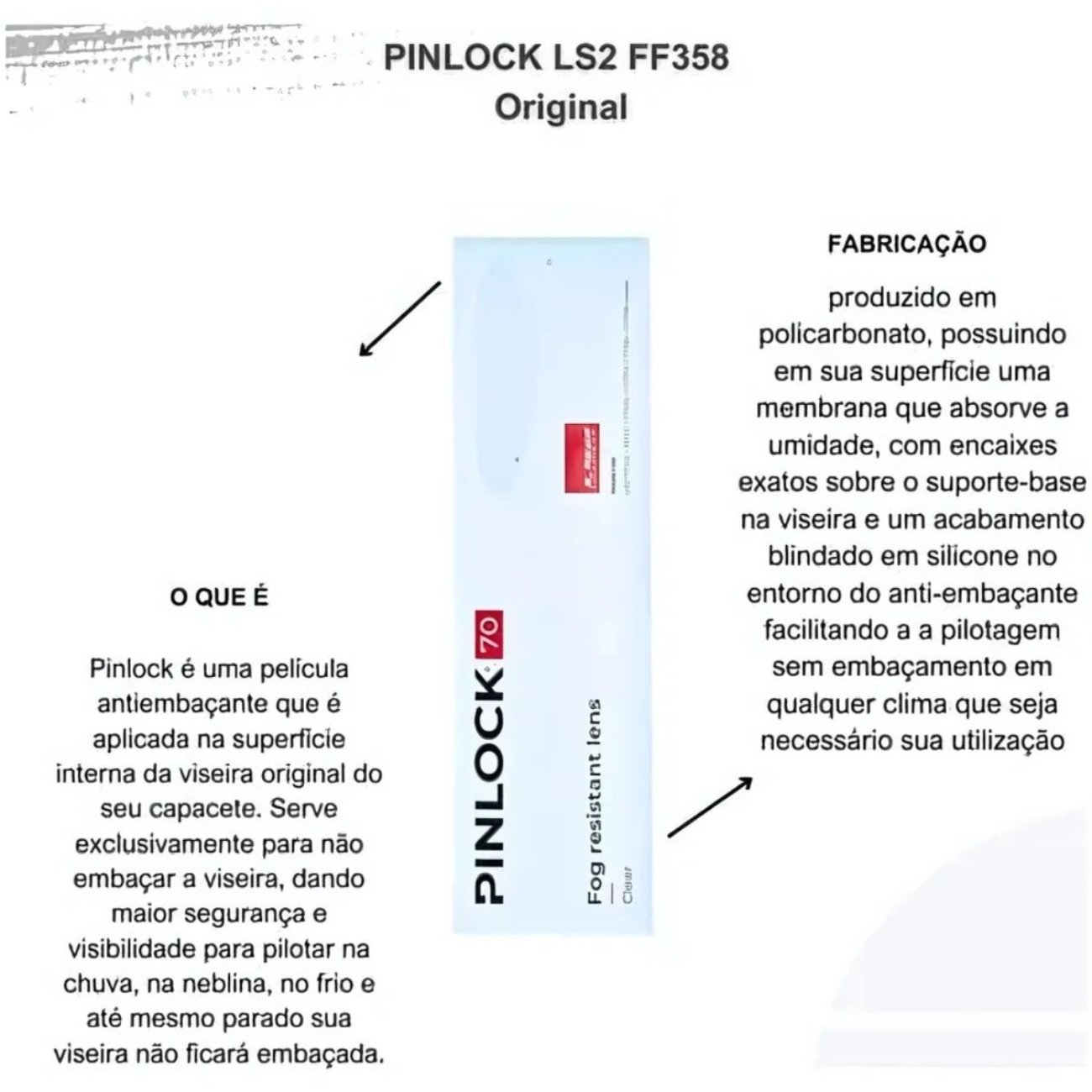 Produzido em policarbonato com membrana de absorção de umidade, o Pinlock original LS2 oferece vedação perfeita com sua borda em silicone, além de encaixe exato nos suportes da viseira original com pinos.