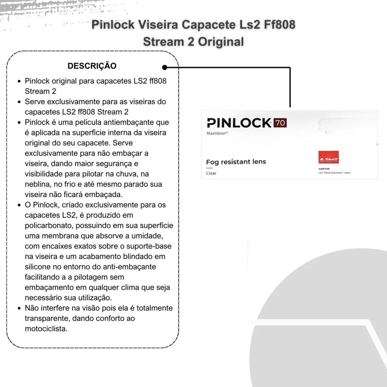 O Pinlock original para capacetes LS2 FF808 Stream 2 é o acessório ideal para quem busca visibilidade clara e segura em qualquer condição climática. Desenvolvido exclusivamente para viseiras com pino do modelo FF808 Stream 2, essa película antiembaçante garante que sua viseira permaneça limpa e sem embaçamento mesmo em dias chuvosos, frios ou com neblina.