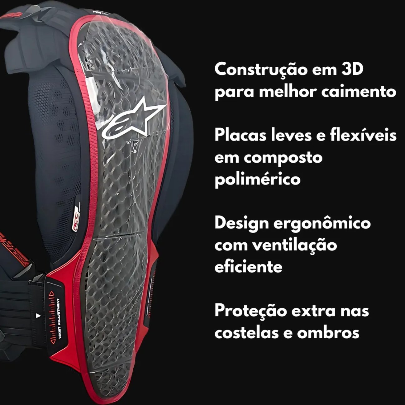 Protetores de costelas ajustáveis, feitos de materiais de alta performance para proteção lateral.