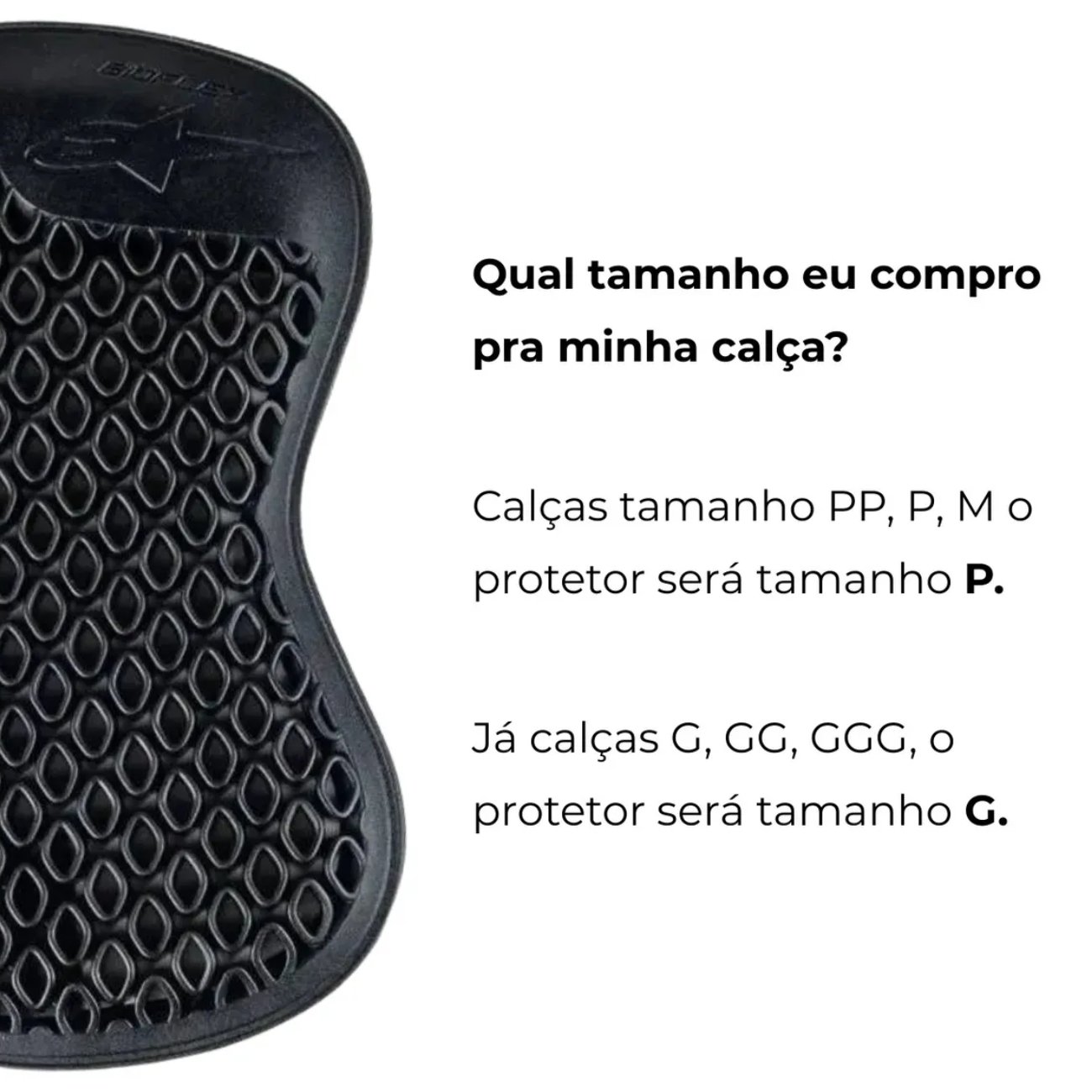 Vendido em par, o protetor é compatível exclusivamente com calças Alpinestars que possuam o bolso específico na região do quadril. Disponível em dois tamanhos, deve ser escolhido conforme o tamanho da calça para um encaixe perfeito e seguro.