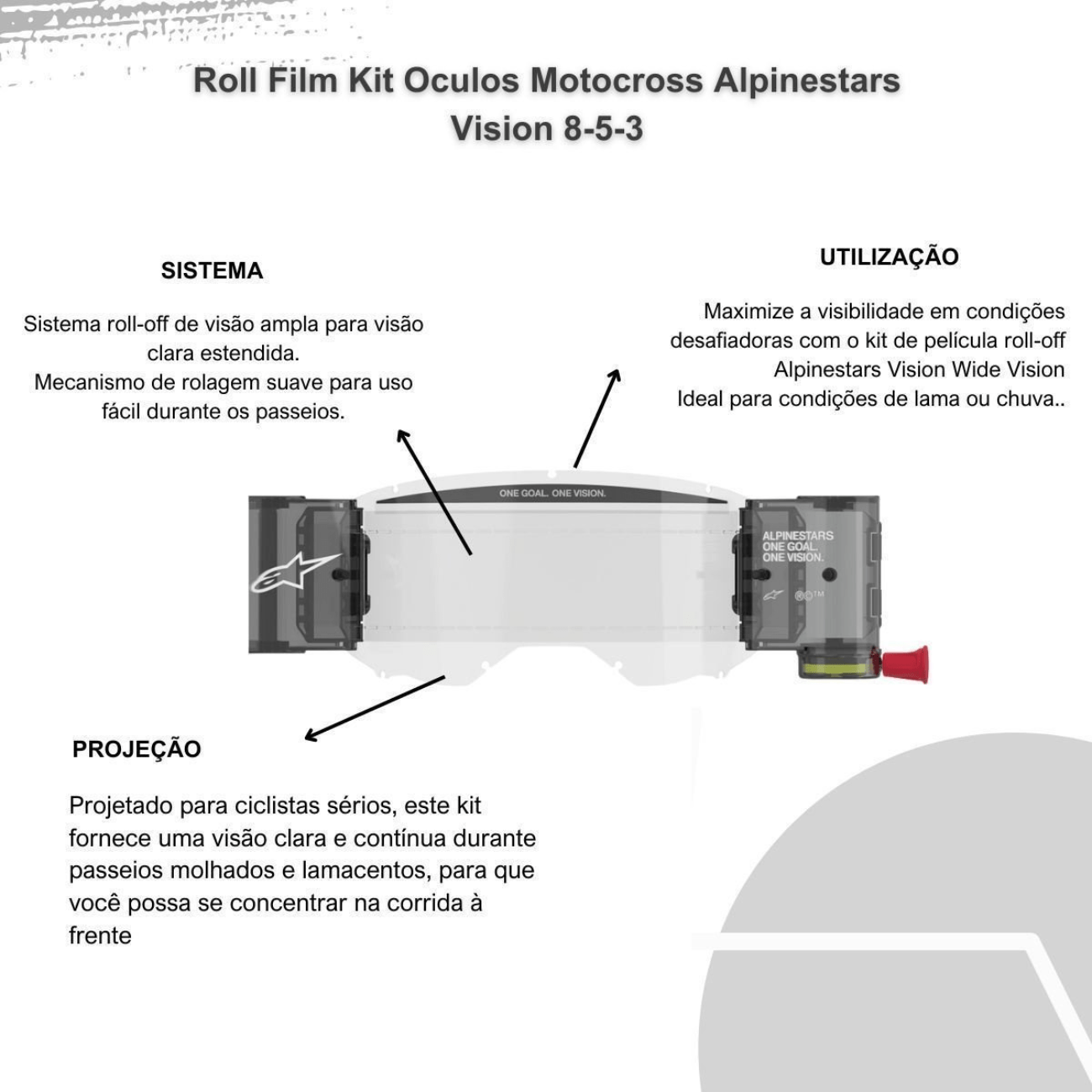 Com mecanismo de rolagem suave e eficiente, este kit oferece praticidade durante a pilotagem, além de cobertura ampla que maximiza o campo de visão. A compatibilidade com os óculos Alpinestars Vision garante encaixe preciso e funcionamento otimizado, ideal para competições ou treinos em ambientes de baixa visibilidade.