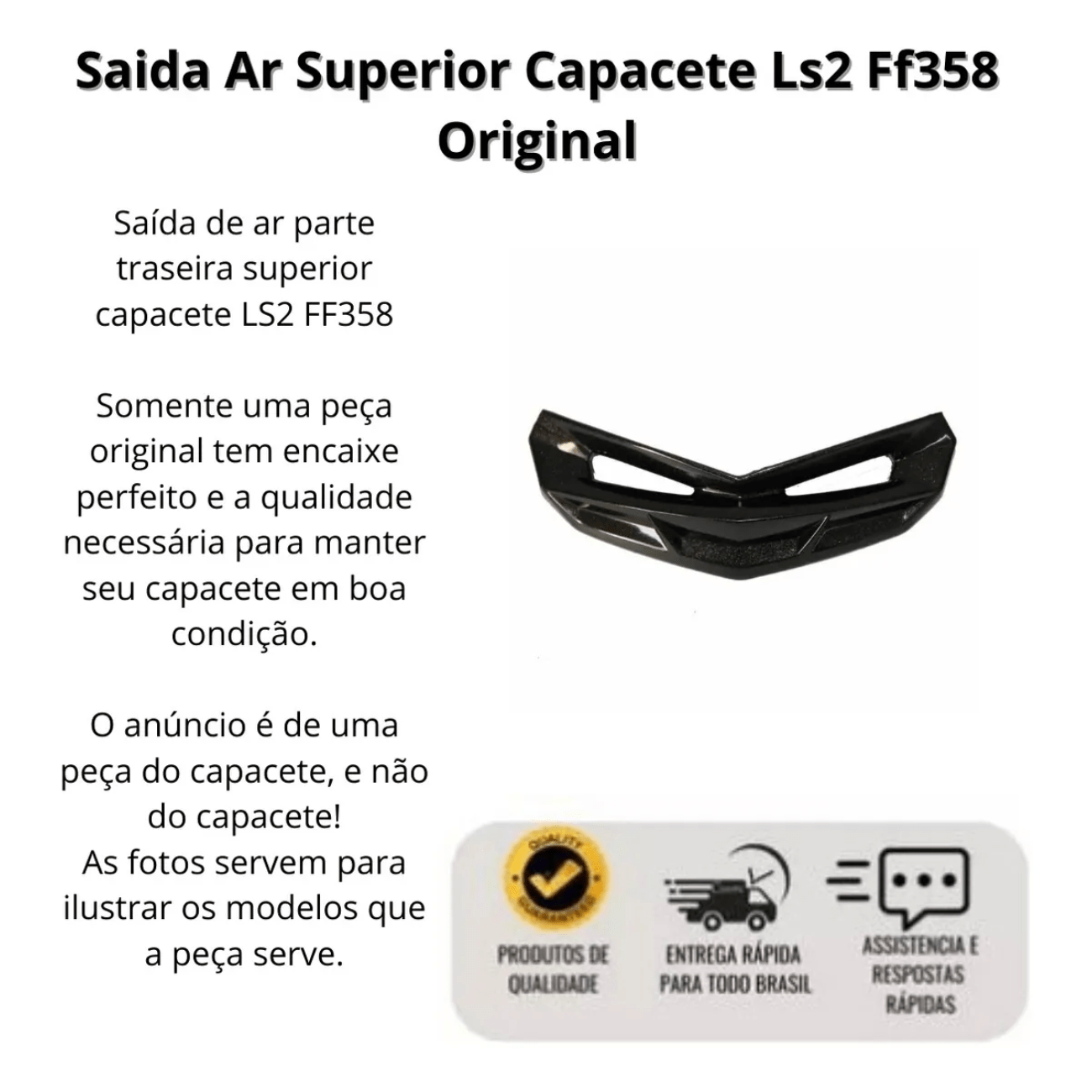 Esta saída de ar traseira superior é uma peça original, projetada para garantir encaixe perfeito e manter a qualidade e a funcionalidade do seu capacete LS2 FF358. Fabricada com materiais resistentes, ela contribui para a ventilação ideal, ajudando a manter o conforto e a segurança durante a pilotagem. Este anúncio refere-se exclusivamente à peça de reposição — não inclui o capacete completo. As imagens são ilustrativas, mostrando os modelos compatíveis para facilitar a identificação.