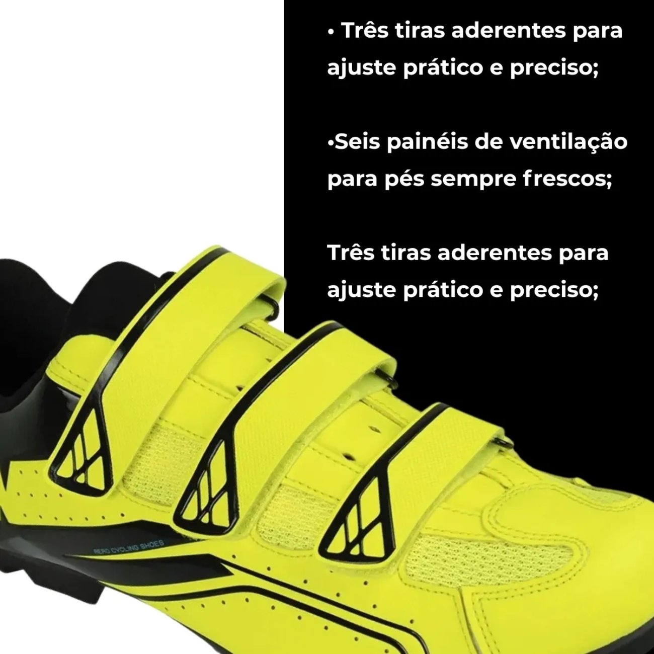 Seu cabedal sintético flexível com seis painéis de ventilação garante excelente respirabilidade. As três tiras de velcro permitem ajustes rápidos e seguros mesmo durante a pedalada. Internamente, a palmilha confortável e a língua perfurada ajudam a evitar o acúmulo de umidade e melhoram o encaixe no pé.