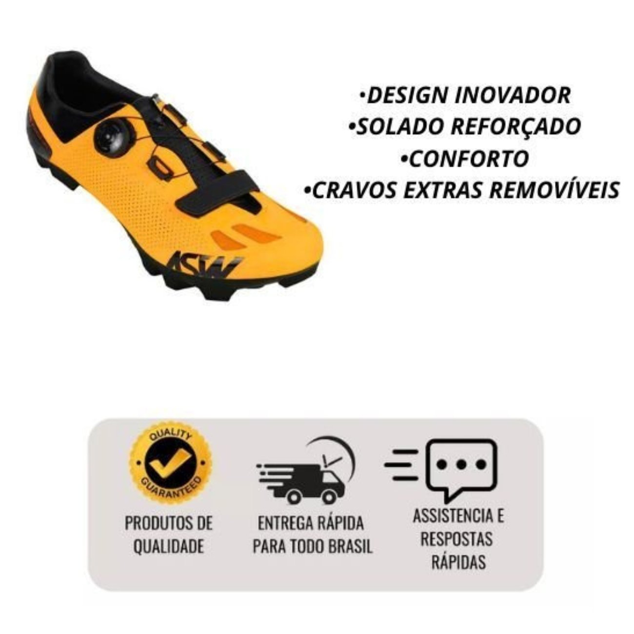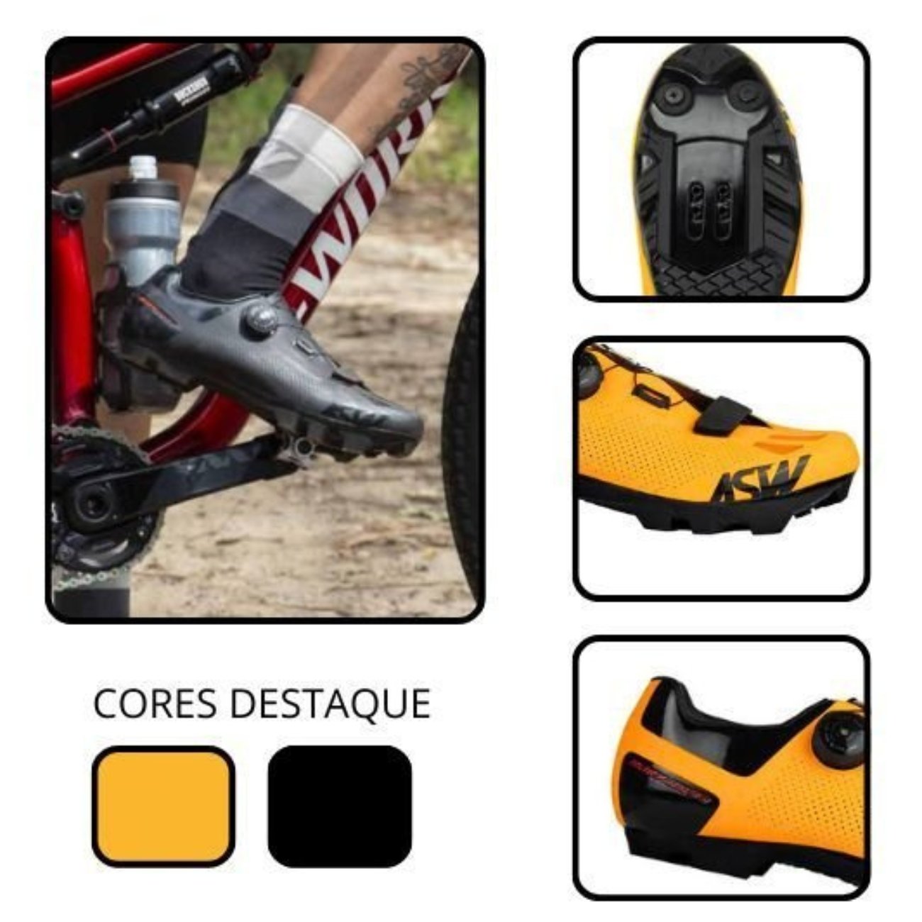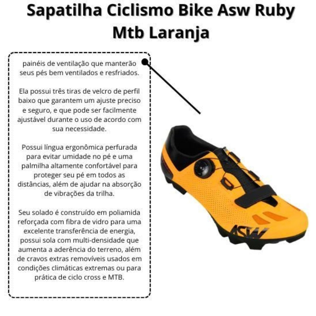 A Sapatilha ASW Ruby MTB Laranja foi desenvolvida para ciclistas que não abrem mão de desempenho, conforto e estilo. Com design moderno, tecnologia avançada e construção anatômica, ela oferece máxima eficiência nas pedaladas, seja em trilhas técnicas, provas de MTB ou treinos intensos.