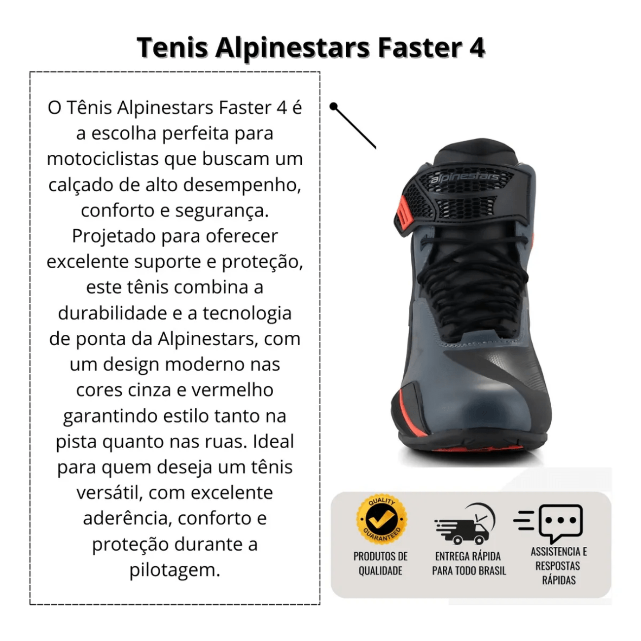 O Tênis Alpinestars Faster 4 é projetado para motociclistas que buscam leveza, respirabilidade e proteção máxima. Desenvolvido com base em décadas de pesquisa no automobilismo, combina microfibra avançada, painéis termo-soldados e malha 3D para criar um calçado técnico, confortável e ergonômico. Com reforços em TPU, sola de borracha texturizada e sistema de fechamento seguro, oferece suporte e segurança superiores em todas as situações de pilotagem, garantindo desempenho e conforto em longos trajetos.