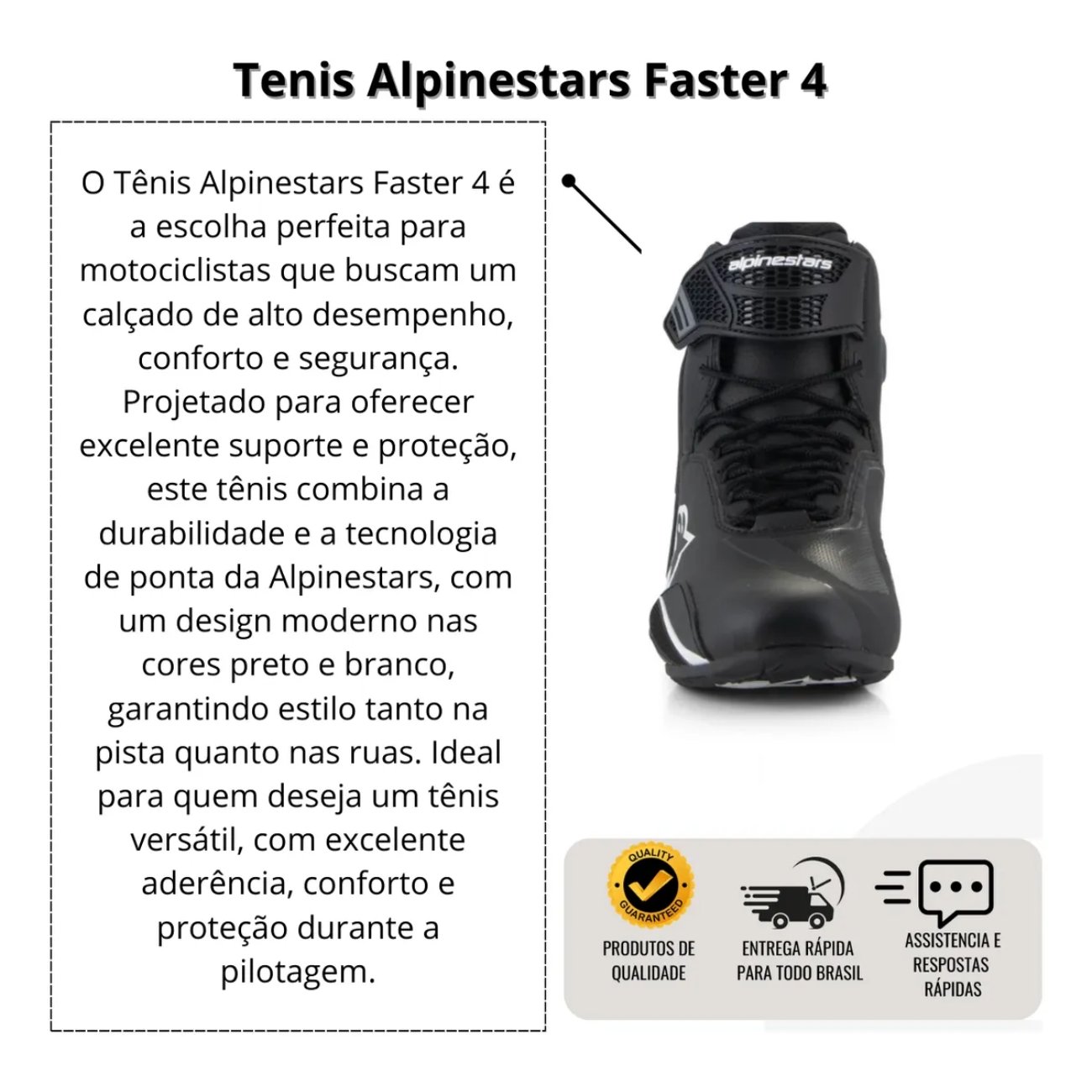 O Alpinestars Faster 4 é o tênis de pilotagem ideal para motociclistas que buscam tecnologia de ponta aliada à máxima proteção e conforto. Com base em décadas de expertise no automobilismo, esse modelo traz um design inovador que combina leveza, respirabilidade e resistência superior para uso em estrada.