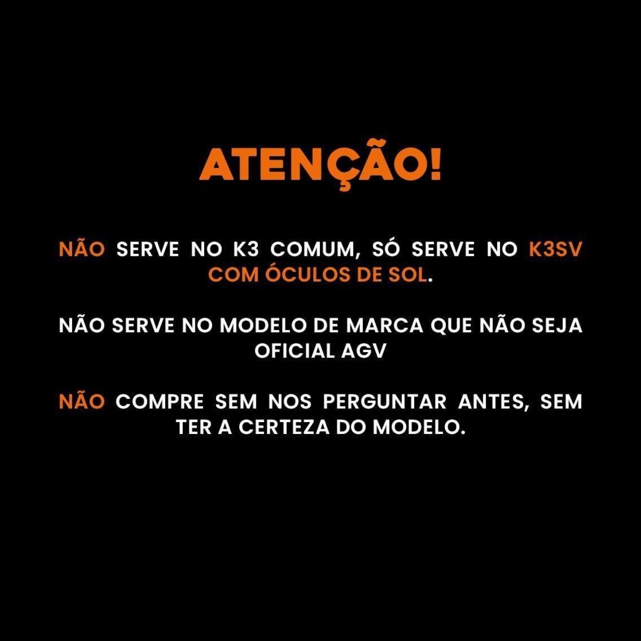 Importante: não é compatível com modelos K3 comuns (sem óculos de sol), com a nova geração K3 (2023 em diante) ou com capacetes não oficiais AGV. Também não serve para o modelo Pro Tork Stealth. Esta viseira não possui pinos para Pinlock, portanto não aceita instalação desse acessório.