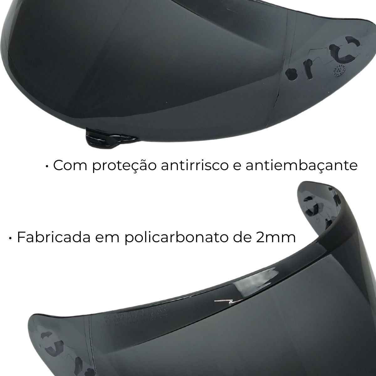 Fabricada em policarbonato com 2mm de espessura, oferece ampla visão, além de contar com proteção antirrisco e antiembaçante, garantindo maior durabilidade e segurança na pilotagem.
