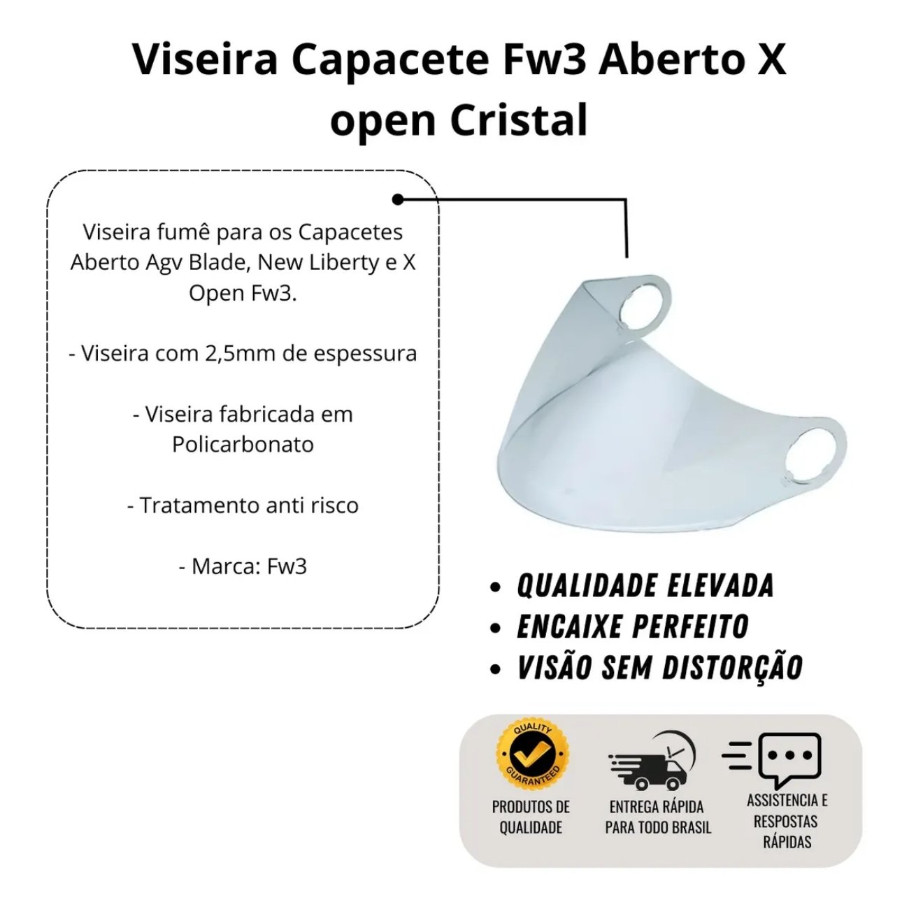 Tenha mais visibilidade e segurança com a viseira FW3 cristal para capacetes abertos modelo X-Open. Produzida com materiais de alta qualidade, ela oferece excelente transparência e durabilidade para o dia a dia na pilotagem.