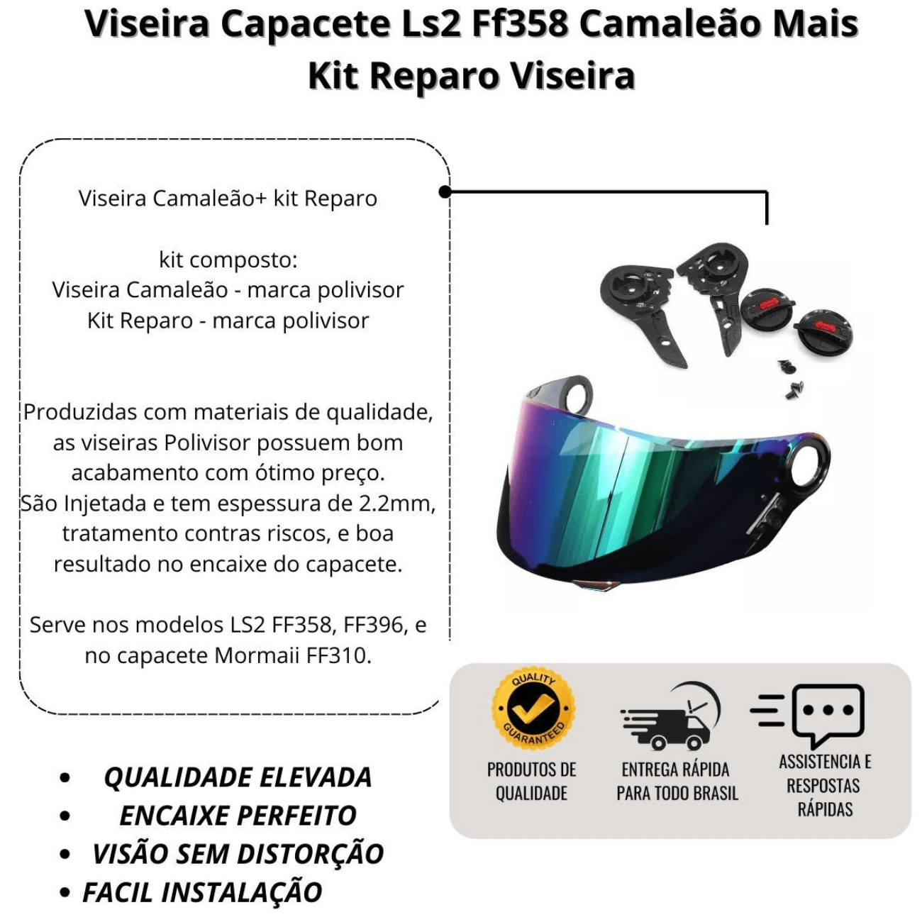 Com acabamento impecável, a viseira Camaleão proporciona um visual diferenciado e é compatível com os modelos LS2 FF358, LS2 FF396 e Mormaii FF310, facilitando o uso em diferentes capacetes. O kit de reparo acompanha todos os componentes necessários para instalação rápida e segura, assegurando encaixe perfeito e funcionalidade máxima.