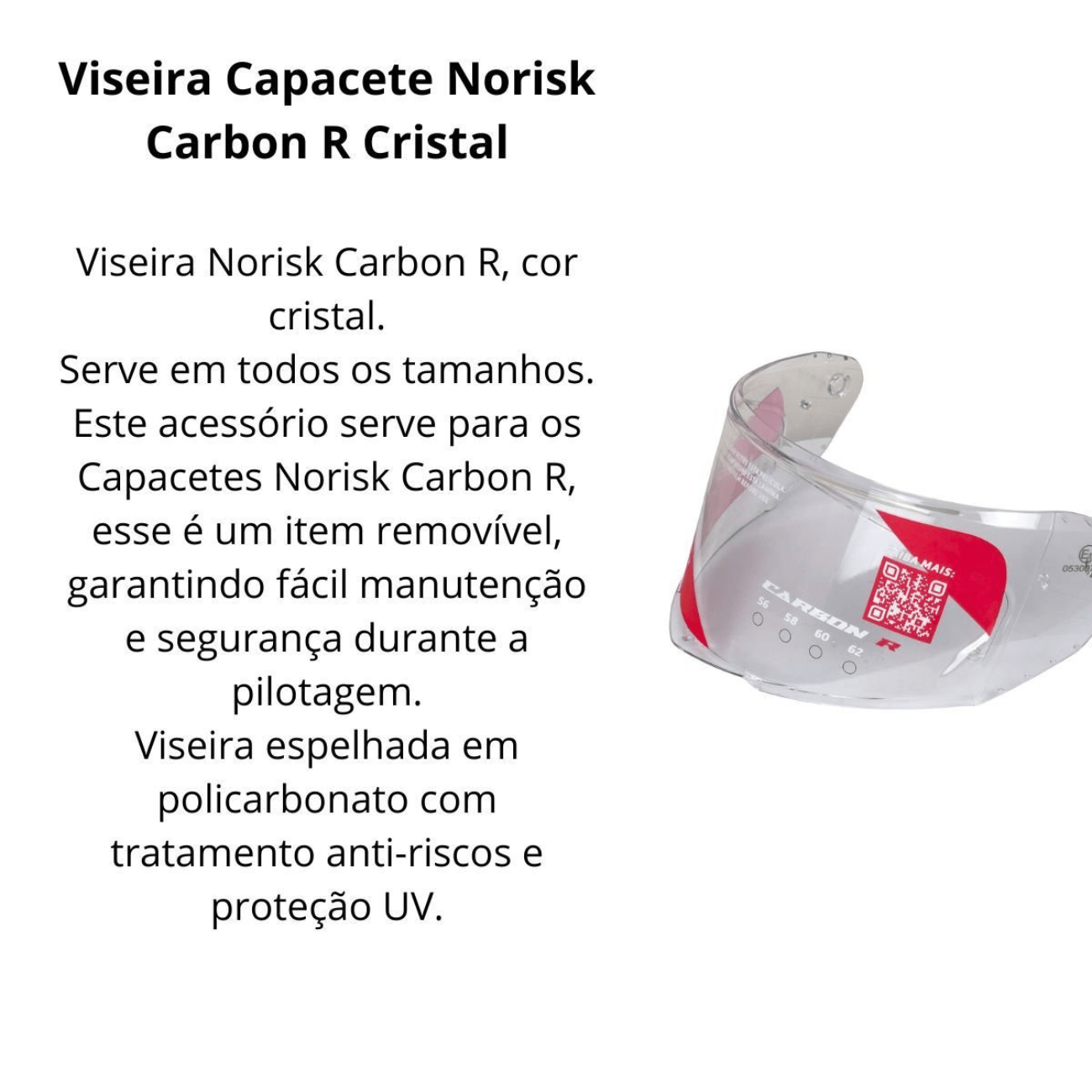 A viseira cristal para capacete Norisk Carbon R é um acessório essencial para quem busca segurança e praticidade na pilotagem. Compatível com todos os tamanhos do modelo Carbon R, este item removível facilita a manutenção e oferece excelente proteção visual.