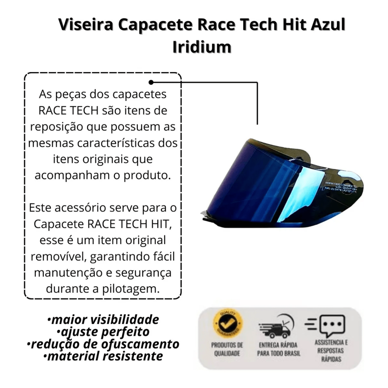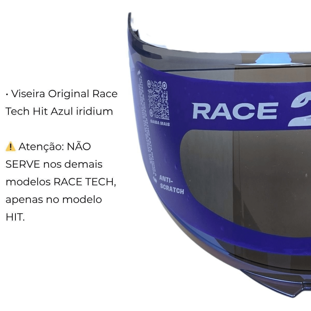 Garanta a segurança e o desempenho do seu capacete Race Tech HIT com a viseira original, desenvolvida para manter as mesmas características e qualidade das peças que acompanham o produto novo. Este acessório removível facilita a manutenção e assegura uma visão clara e protegida durante suas pilotagens.