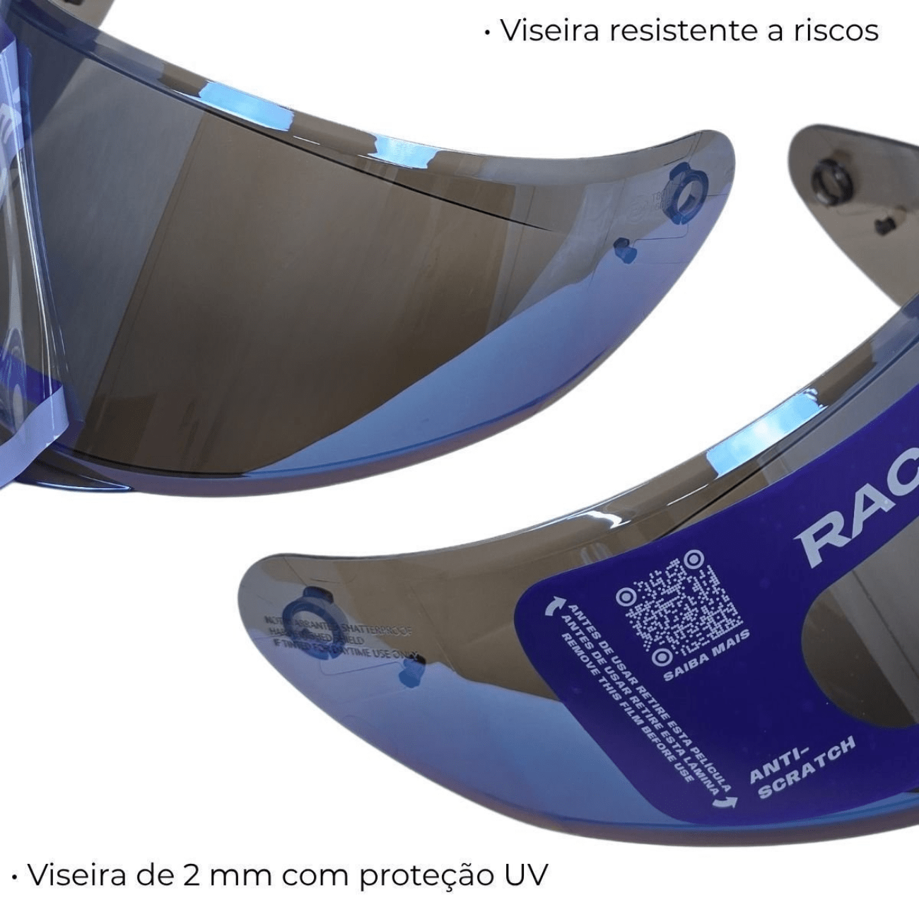 Produzida em material resistente de 2 mm, a viseira conta com proteção contra raios UV e tratamento anti-risco, proporcionando durabilidade e segurança adicionais.