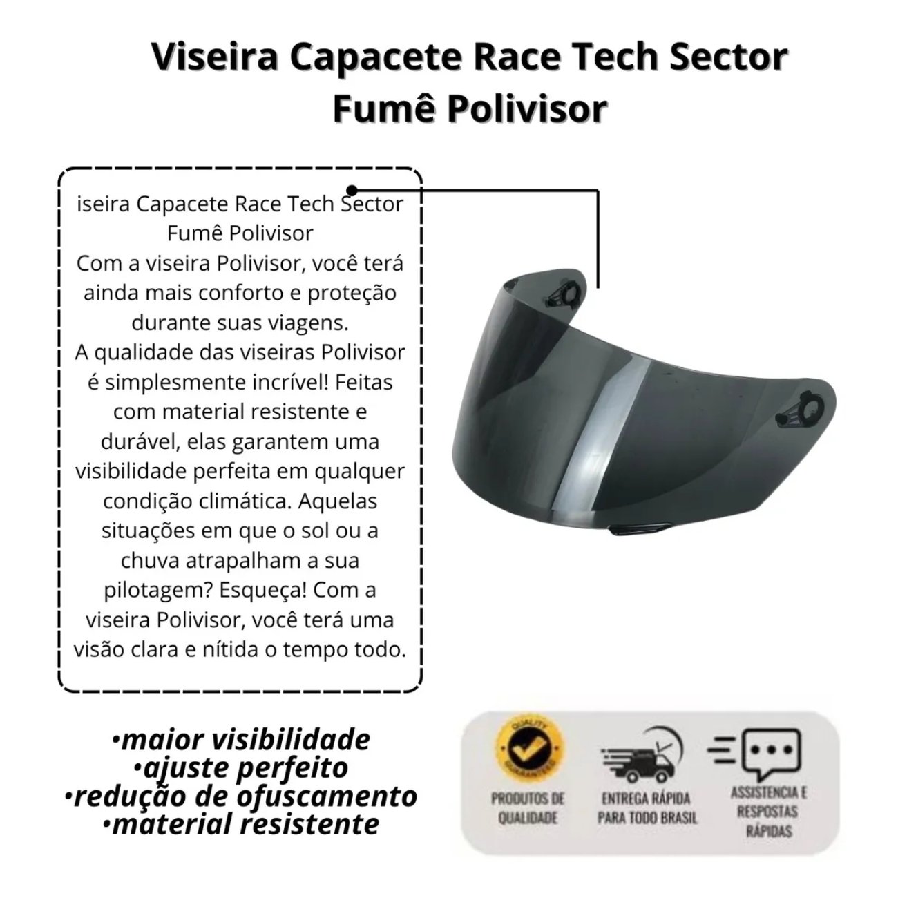 A Viseira Fumê Polivisor é compatível exclusivamente com o capacete Race Tech modelo Sector. Produzida com materiais resistentes e tecnologia de ponta, ela oferece alta proteção, conforto e estilo para o motociclista que enfrenta o dia a dia sob sol forte ou em viagens longas.