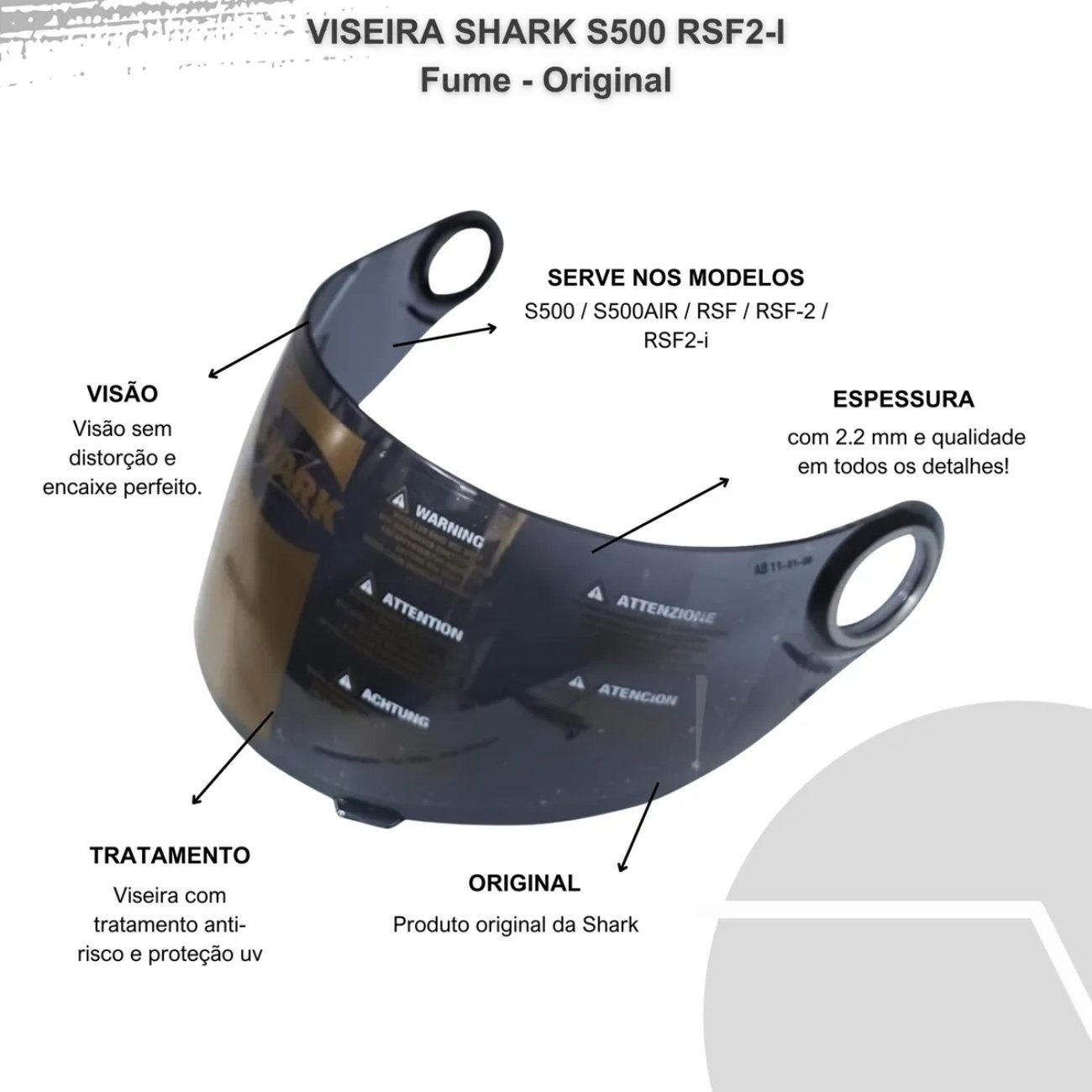 O kit com 2 viseiras fumê foi desenvolvido para garantir proteção solar, durabilidade e encaixe perfeito nos capacetes Shark S500, S500-AIR, RSF-2i e RSF-3. Fabricadas com material de alta resistência, proporcionam excelente visibilidade e reduzem os reflexos, protegendo os olhos da luz solar intensa e oferecendo mais conforto durante a pilotagem.